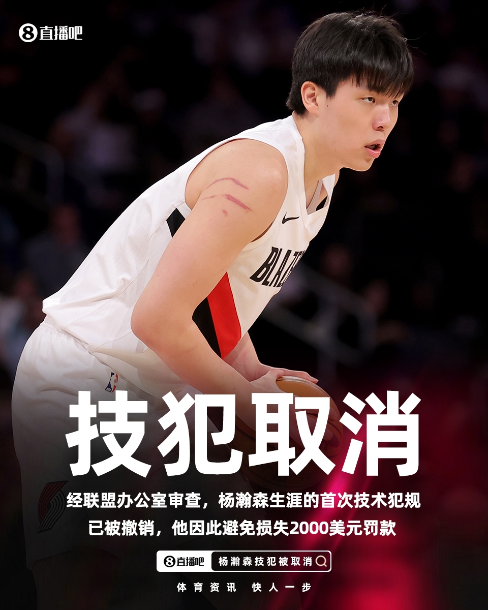 今日NBA官方宣布,经联盟办公室审查后,双方的技犯已被撤销。杨瀚森职业生涯目前还没有吃到技术犯规。